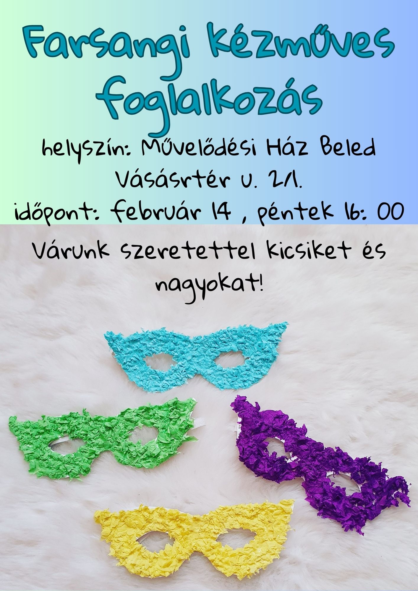 Február 14-én, pénteken, délután négy órától a beledi Művelődési Házban farsangi kézműves foglalkozásra várnak mindenkit, kicsiket és nagyokat egyaránt.