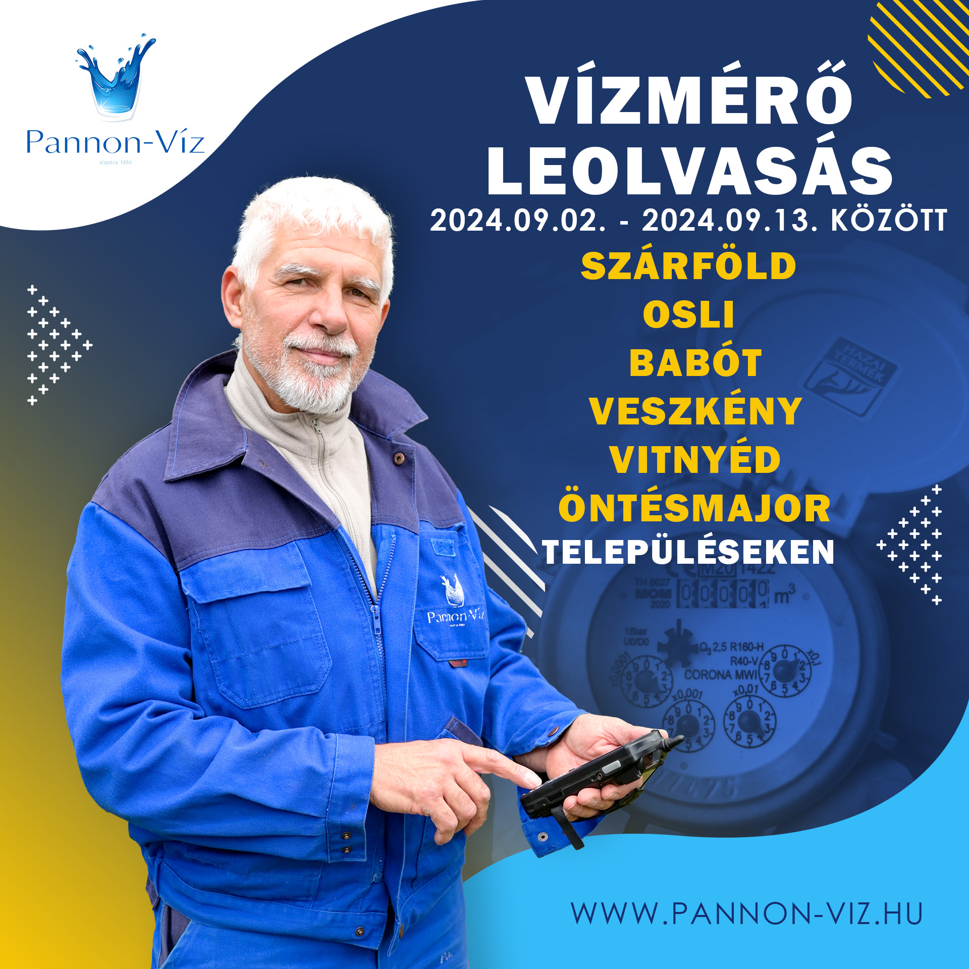 A Pannon-Víz Zrt. tájékoztatja a felhasználókat, hogy szeptember 2. és szeptember 13. között lakossági vízmérő leolvasást végeznek az alábbi településeken: