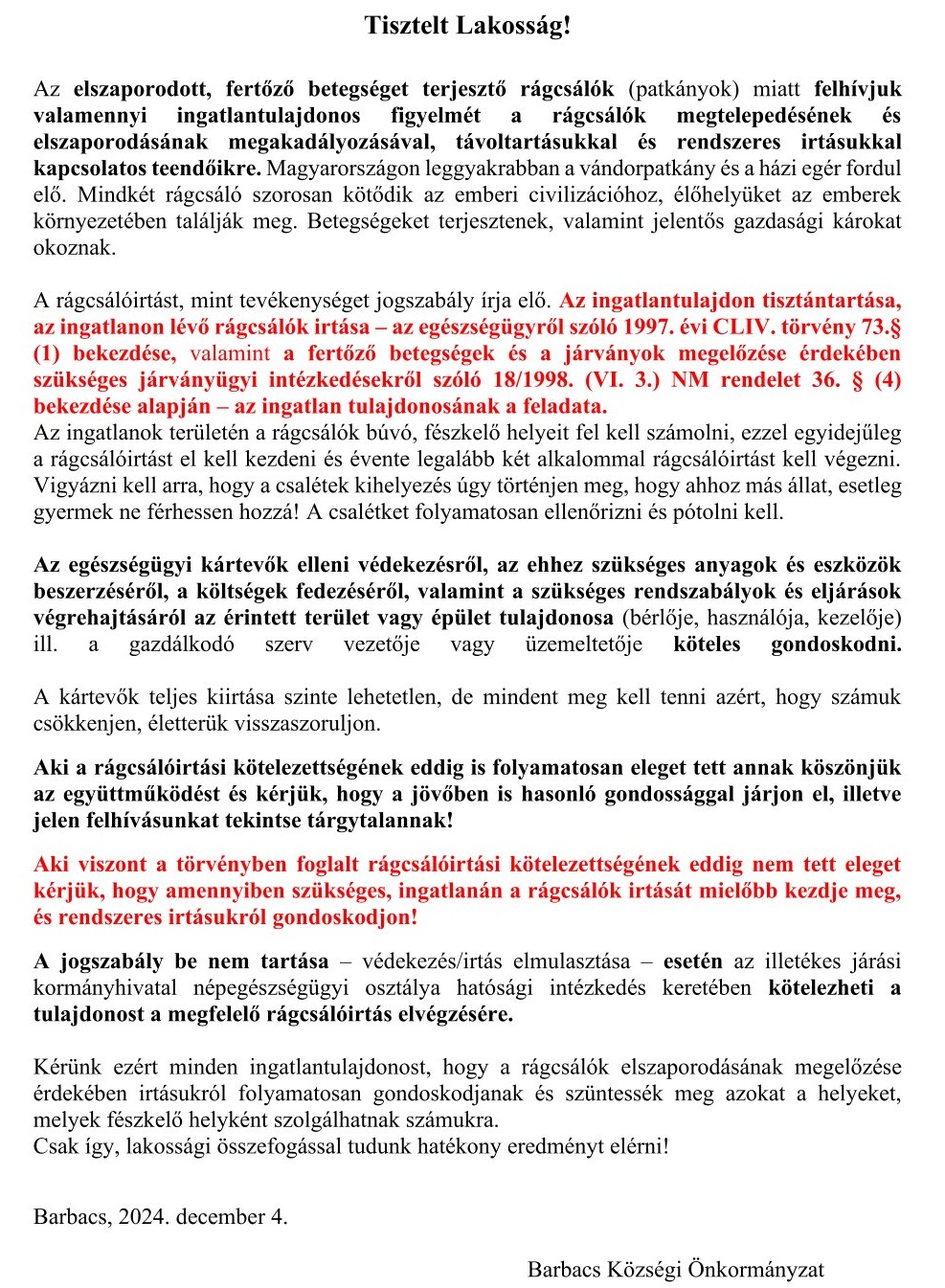 A Barbacsi Községi Önkormányzat fontos felhívást tett közzé a rágcsálóirtás kapcsán. Az elszaporodott, fertőző betegségeket terjesztő rágcsálók, például patkányok és egerek veszélyt jelentenek az emberi egészségre és jelentős gazdasági károkat okozhatnak.