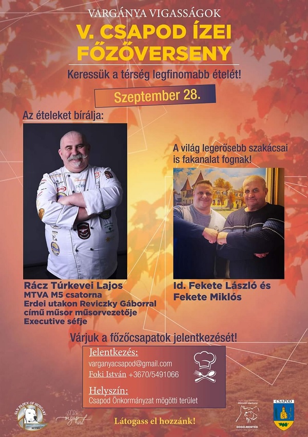 Szeptember 28-án Csapodon ismét megrendezik a térség egyik legvidámabb főzőversenyét a helyi vigasságok részeként. Az elkészült ételeket Rácz Túrkevei Lajos, az Erdei utakon Reviczky Gáborral című műsor executive séfje bírálja.