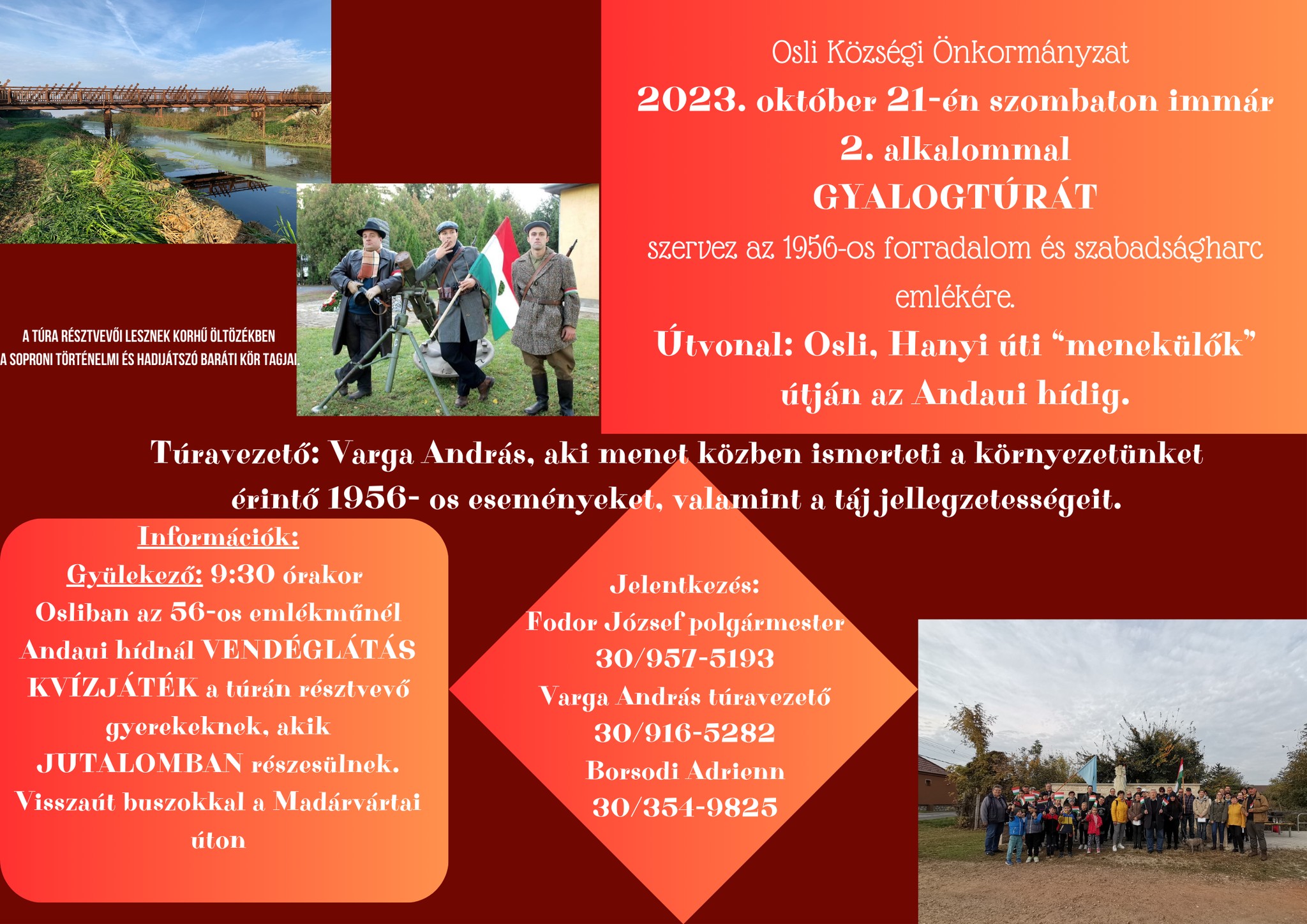 Osli Községi Önkormányzata 2023. október 21-én gyalogtúrát szervez az Andaui hídhoz az 1956-os forradalom és szabadságharc emlékére.