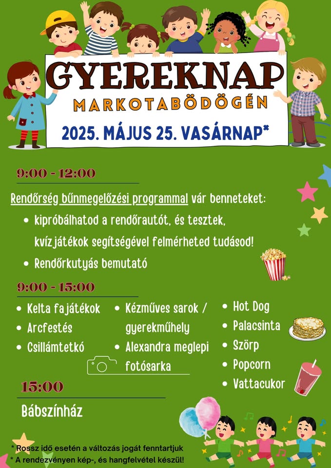 Május 25-én, szombaton szeretettel várnak minden gyermeket és családot Markotabödögére egy felejthetetlen gyereknapi programra! A jó hangulat, izgalmas bemutatók és vidám játékok garantáltak – ne maradj le róla!