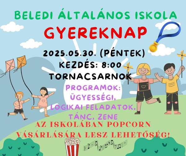 A Beledi Általános Iskolában május 30-án, pénteken kerül megrendezésre a várva várt Gyereknap, amely reggel 8 órakor veszi kezdetét az iskola tornacsarnokában.
