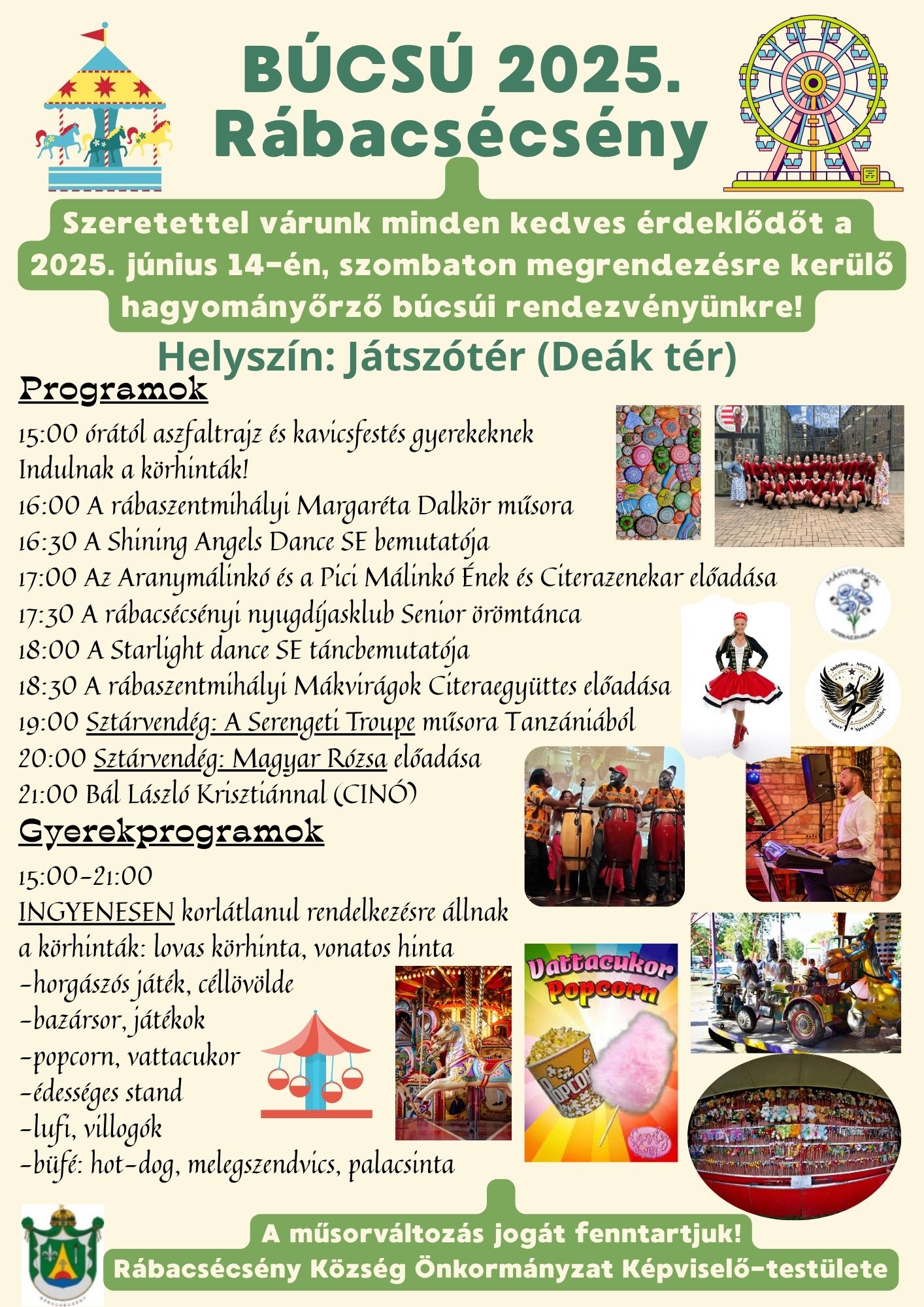 Rábacsécsény község idén is nagyszabású hagyományőrző búcsúval várja a lakosságot és az érdeklődő vendégeket!