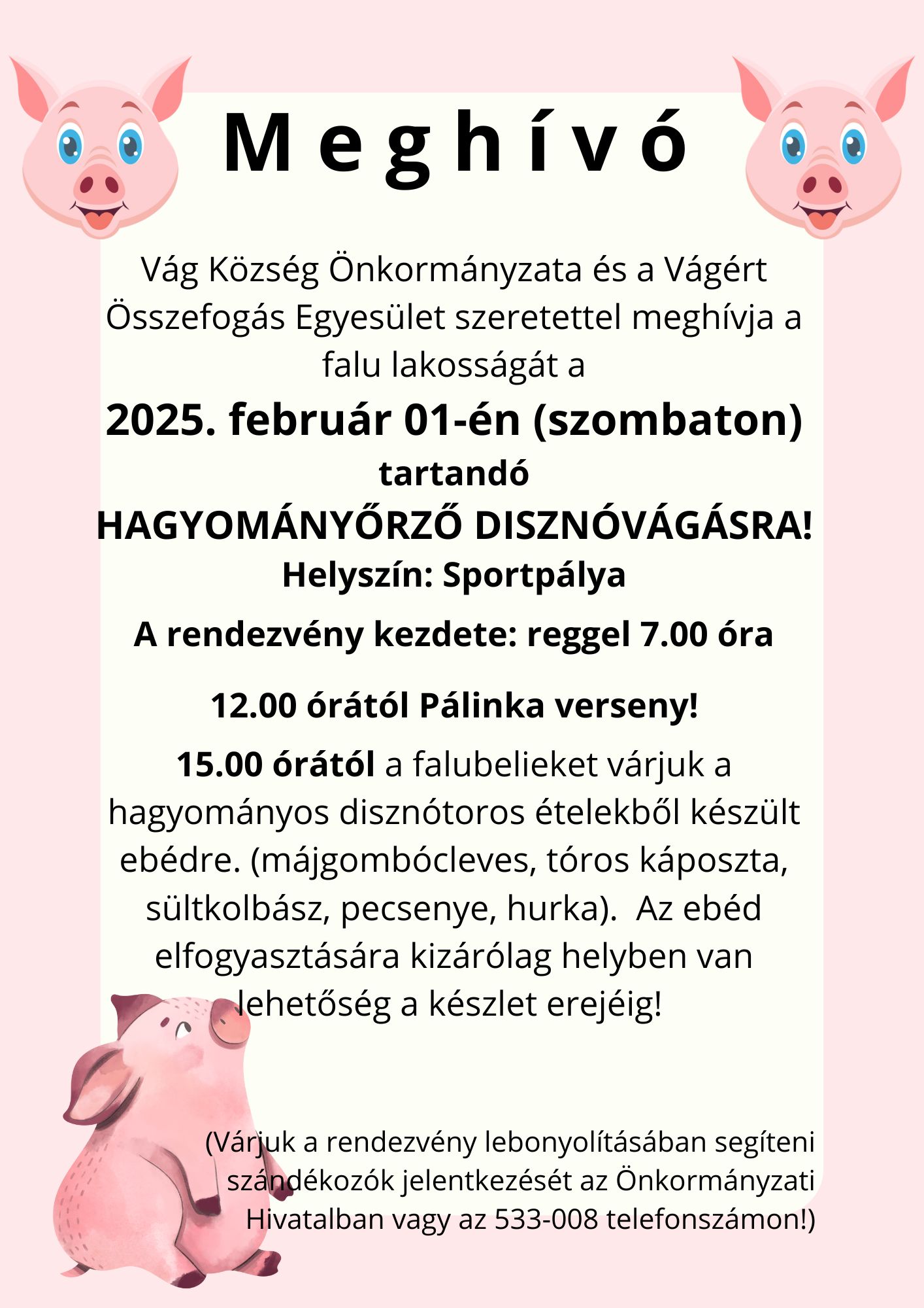 Vág Község Önkormányzata és a Vágért Összefogás Egyesület szeretettel meghívja a falu lakosságát egy hagyományőrző disznóvágásra, amelyre február 1-jén, szombaton kerül sor.