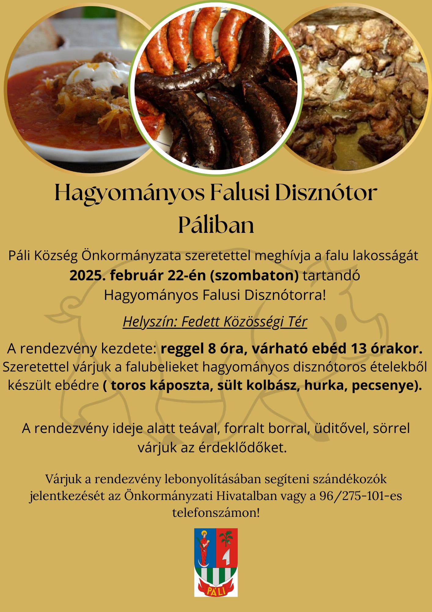 Páli Község Önkormányzata szeretettel meghív minden érdeklődőt a február 22-én, szombaton megrendezésre kerülő Hagyományos Falusi Disznótorra!