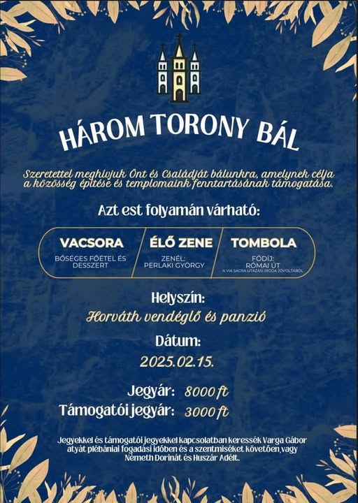 Február 15-én, szombat kerül megrendezésre a Három Torony Bál Egyeden, amelynek célja a közösség építése és a helyi templomok fenntartásának támogatása.