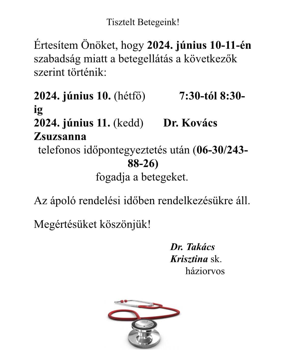 Szanyban szabadság miatt a betegellátás a megszokottól eltérő módon történik június 10 és 11-én.