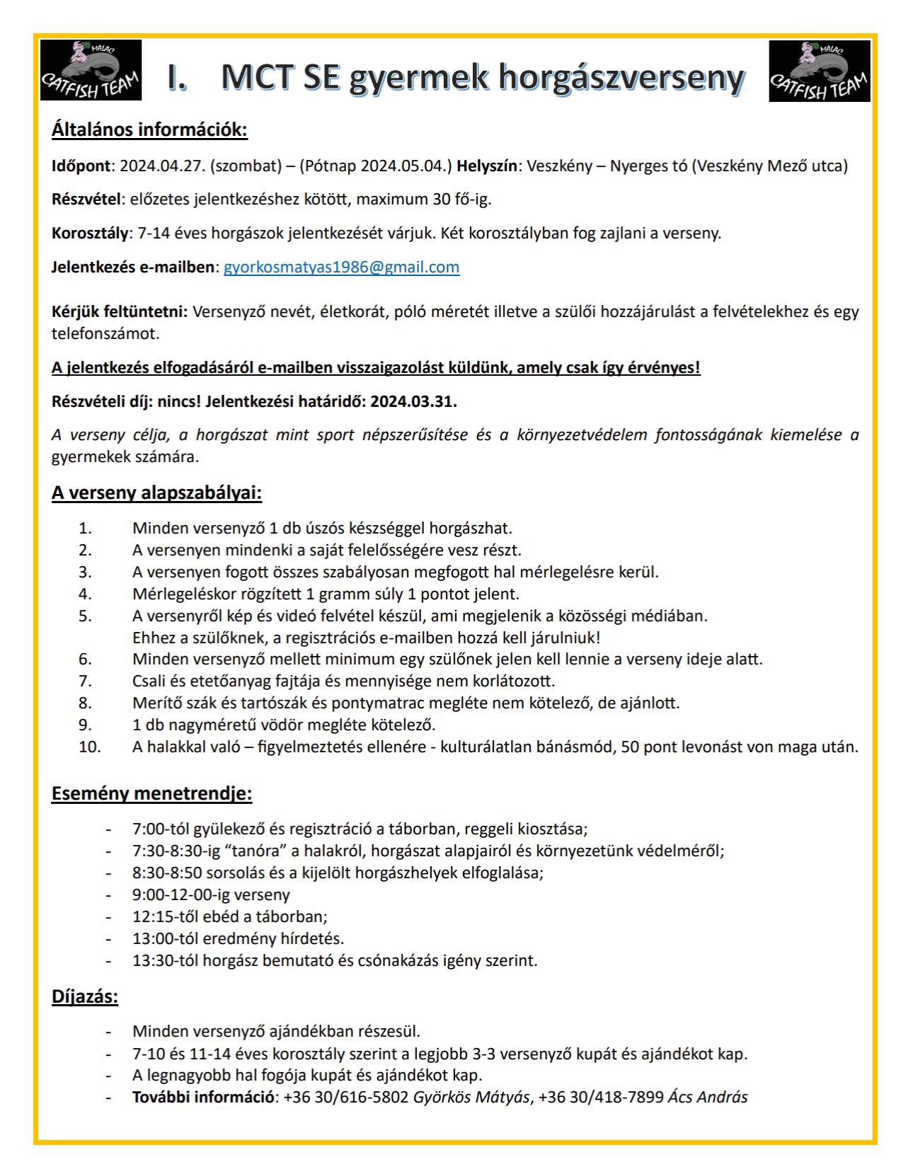 Elindult a jelentkezés az I. MCT SE gyermek horgászversenyre, melynek célja a horgászat, mint sport népszerűsítése és a környezetvédelem fontosságának kiemelése a jövő horgásznemzedéke számára.