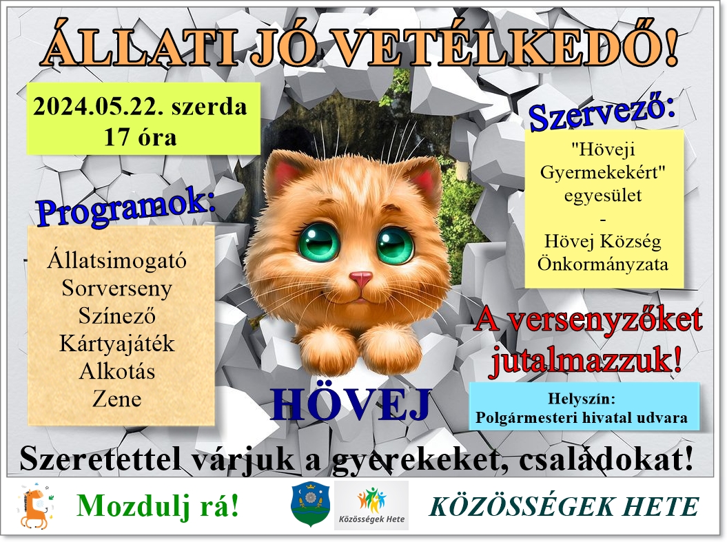 "Állati jó vetélkedőt" szervez a Höveji Gyermekekért Egyesület és a falu önkormányzata a gyerekeknek, a családoknak. A rendezvényen állatsimogató, színező, kártyajáték és zene várja a látogatókat. A sorversenyeken összemérhetik ügyességüket és gyorsaságukat a résztvevők, és a legjobbak jutalomban részesülnek.