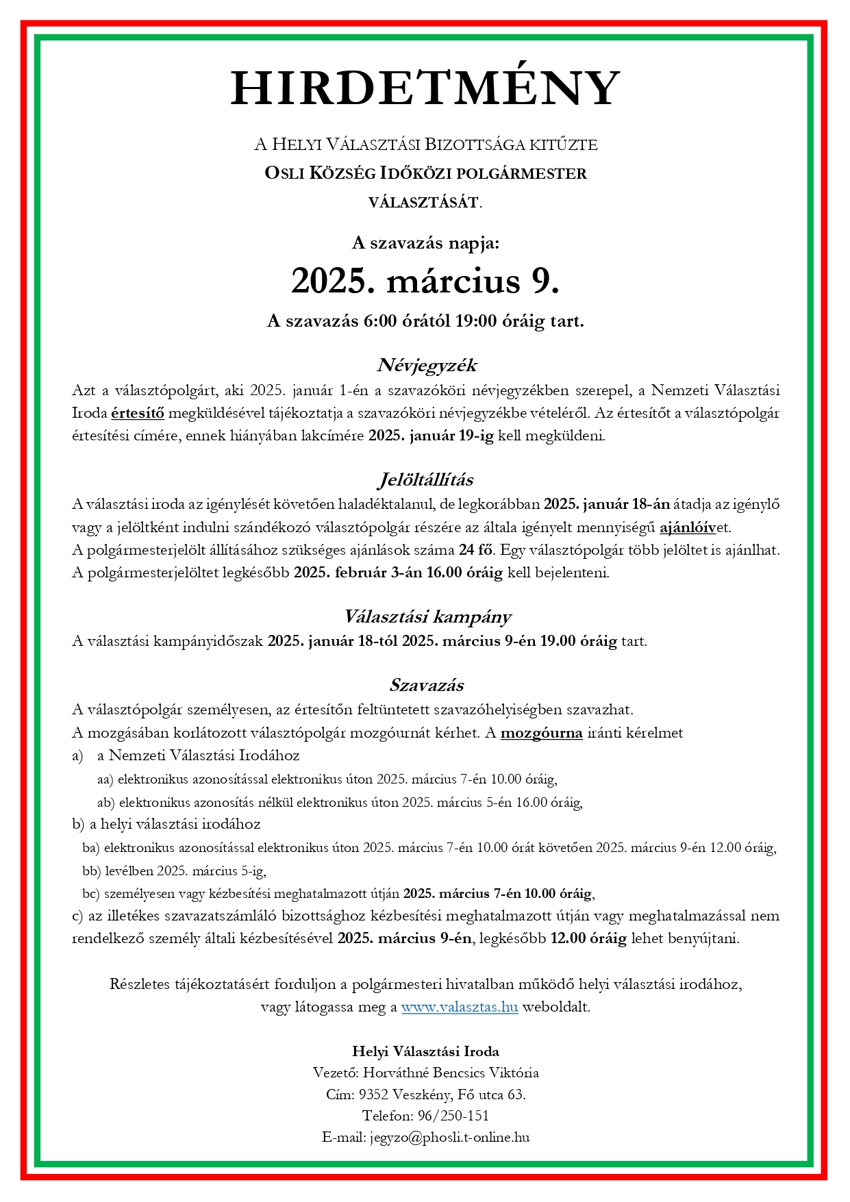 A Helyi Választási Bizottság kitűzte Osli Község időközi polgármester-választását március 9-.ére, amely napon 6:00 és 19:00 óra között lehet leadni a szavazatokat.