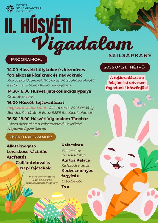 Szilsárkány község idén is színes programokkal várja a családokat a II. Húsvéti Vigadalom alkalmából, amely április 21-én, hétfőn kerül megrendezésre.