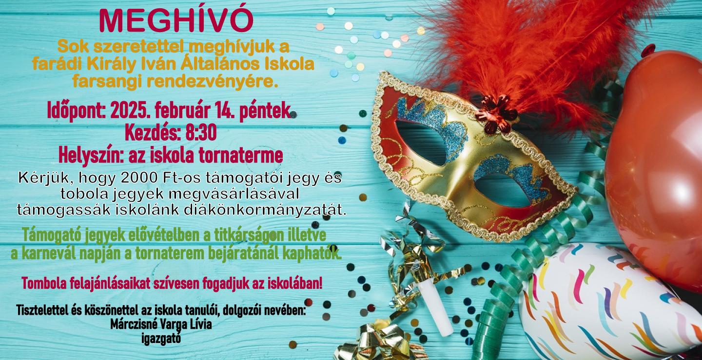 A Király Iván Általános Iskola diákönkormányzata február 14-én, pénteken reggel 8:30-tól rendezi meg farsangi karneválját az iskola tornatermében. A szervezők arra kérik a résztvevőket, hogy támogassák az iskolai programokat egy 2000 forintos támogatói jegy vagy tombola megvásárlásával.