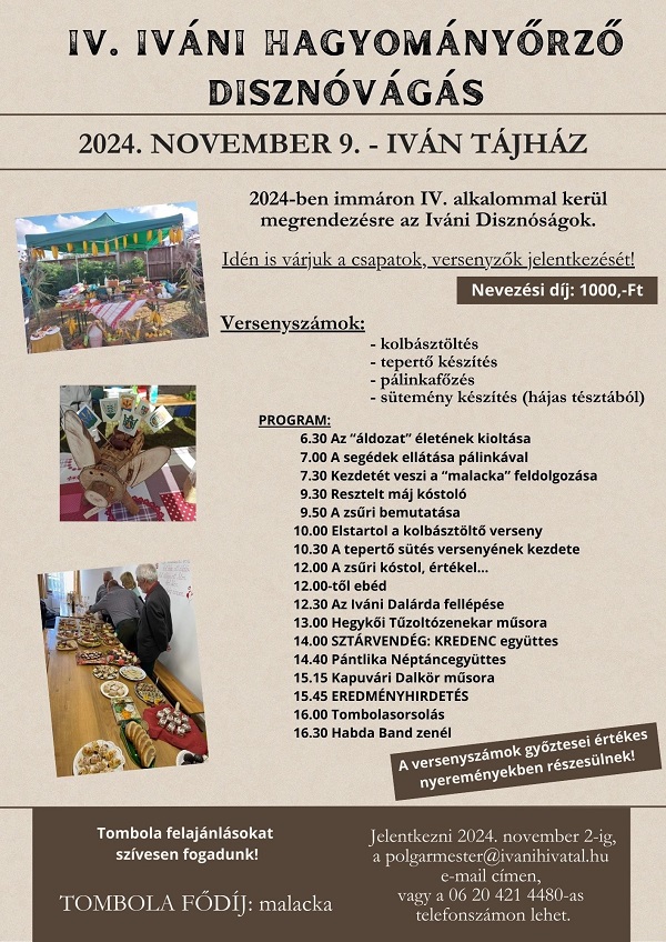 2024. november 9-én immár negyedik alkalommal kerül megrendezésre az Iváni Hagyományőrző Disznóvágás az Iván Tájházban.