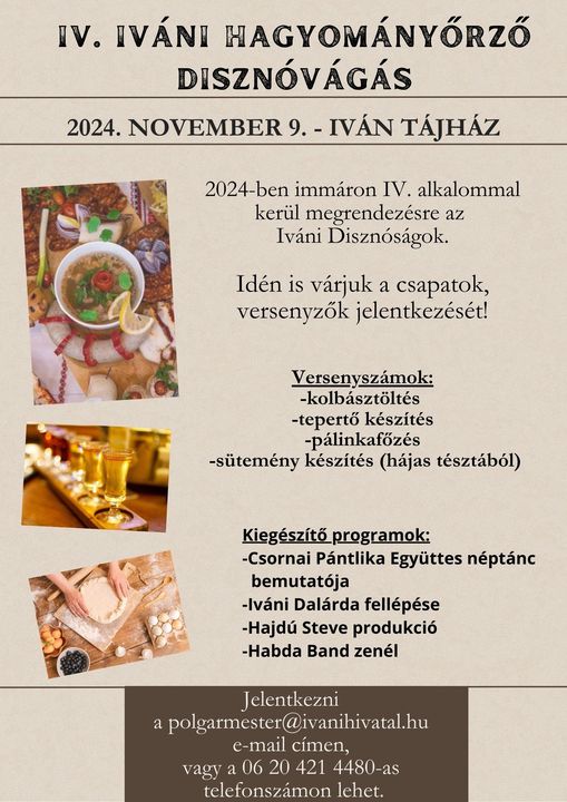 Novemberben Iván település ismét megrendezi az immár hagyománnyá vált Iván Hagyományőrző Disznóvágást, melyen már negyedik alkalommal mérhetik össze tudásukat a helyi és környékbeli csapatok.