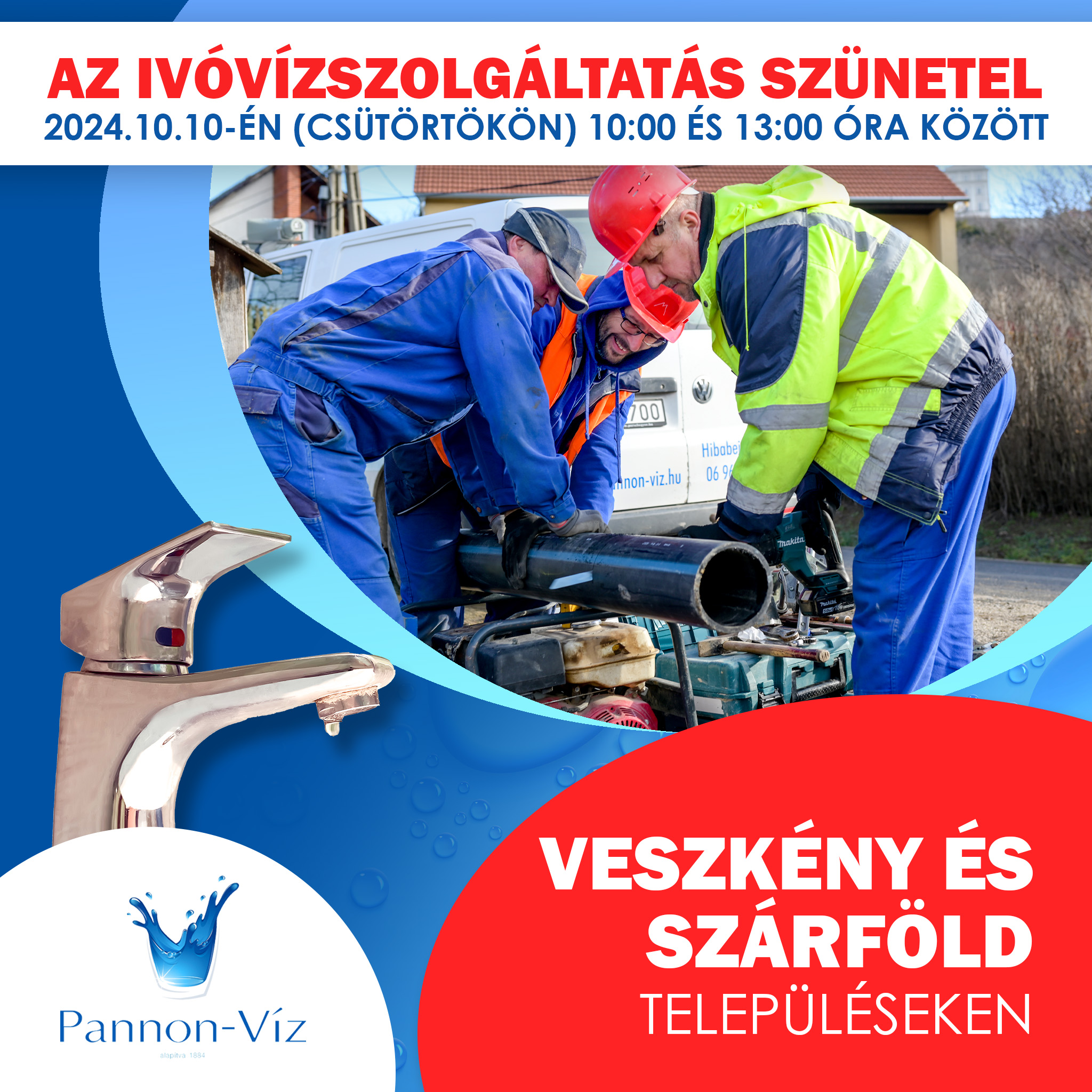 Október 10-én (csütörtökön) 10:00 és 13:00 óra között Veszkény község területén egy új vezetékszakasz rákötését végzi az ivóvízrendszerre.