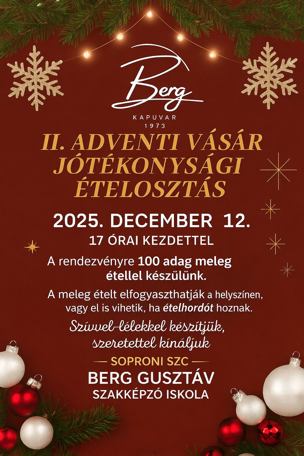 A Soproni SZC Berg Gusztáv Szakképző Iskolája szívvel-lélekkel készíti az ételeket, és szeretettel kínálja fel azokat mindazoknak, akik ellátogatnak a jótékonysági eseményre. A szervezők bíznak abban, hogy az adventi időszak meghittsége és a közösség ereje sokak számára jelent majd valódi segítséget és reményt.
