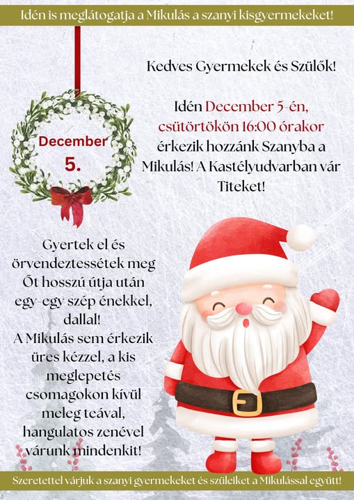 A szanyi gyerekek és szülők egy zenés, meghitt találkozón üdvözölhetik a Mikulást, december 5., csütörtökön, délután négy órakor, aki meglepetéscsomagokat és meleg teát is hoz.