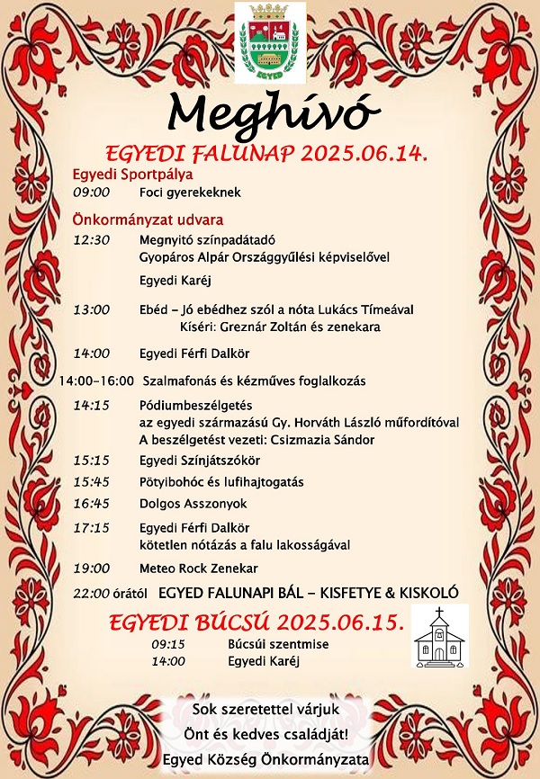 A rendezvény ünnepélyes megnyitóját Gyopáros Alpár országgyűlési képviselő részvételével tartják. A jó hangulatot az Egyedi Karéj, majd ebéd közben Lukács Tímea és Greznár Zoltán zenekara biztosítja. A délután folyamán fellép az Egyedi Férfi Dalkör, lesz szalmafonás, kézműves foglalkozás, valamint különleges pódiumbeszélgetés Gy. Horváth László műfordítóval.