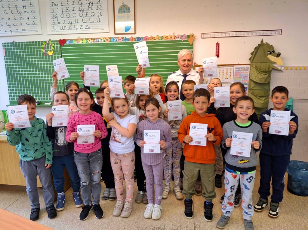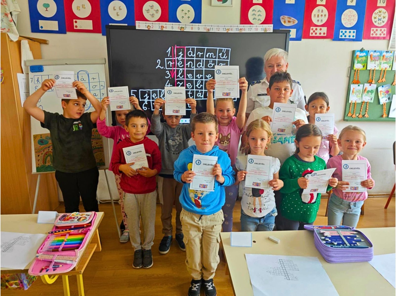 A 2024/2025-ös tanév KEVE-programjának zárásakor Nagy Lívia r. törzszászlós, a Csornai Rendőrkapitányság baleset-megelőzési titkára minden résztvevő kisdiáknak emléklapot és egy apró ajándékot adott át.