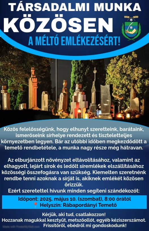A Rábapordányi Önkormányzat szeretettel hívja a lakosságot egy közösségi összefogásra május 10-én, szombaton reggel 8 órától, melynek célja a helyi temető rendbetétele.