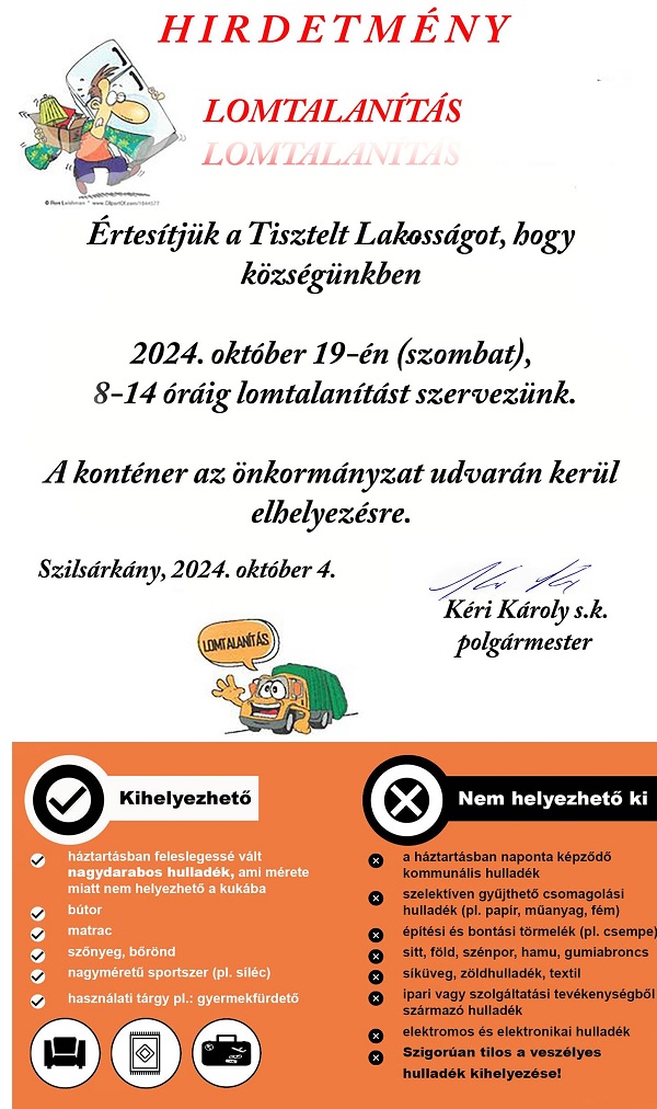 Szilsárkányban a lomtalanításra október 19-én, szombaton kerül sor, reggel 8 és délután 2 óra között.