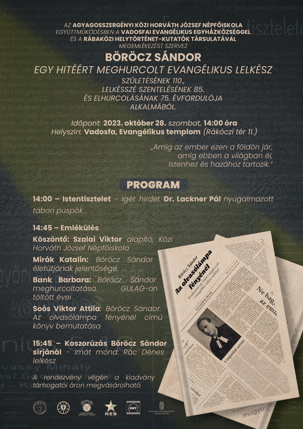 Az agyagosszergényi Közi Horváth József Népfőiskola, együttműködésben a Vadosfai Evangélikus Egyházközséggel és a Rábaközi Helytörténet-kutatók Társulatával, megemlékezést szervez Vadosfán, október 28-án, néhai Böröcz Sándor hitéért meghurcolt evangélikus lelkész emlékére.