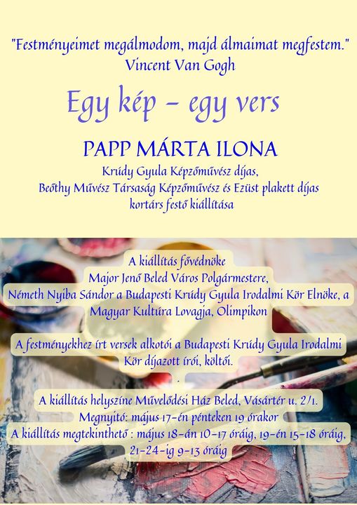 A Beledi Művelődési Ház ad otthont a négy tárlatnak, melyeknek megnyitójára ma este 7 órakor várják az érdeklődőket. A kiállítás május 18-tól 24-ig nyitva áll a látogatók előtt.