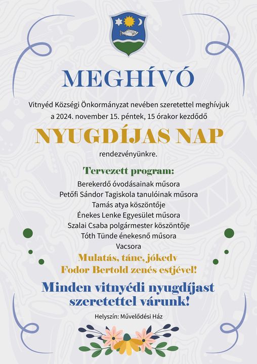 Vitnyéd Községi Önkormányzat meghívja a község nyugdíjasait a november 15-én, pénteken 15:00 órakor kezdődő Nyugdíjas Napra.