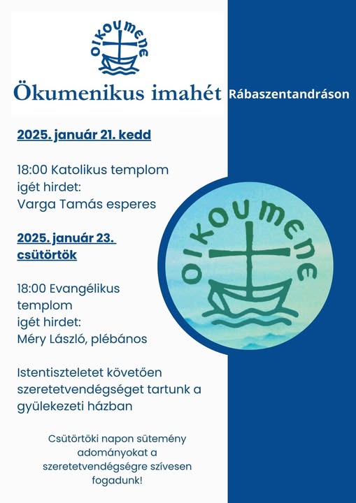 Január 21-én és 23-án Rábaszentandráson Ökumenikus Imahetet tartanak, amelyen a különböző felekezetek képviselői közösen imádkoznak.