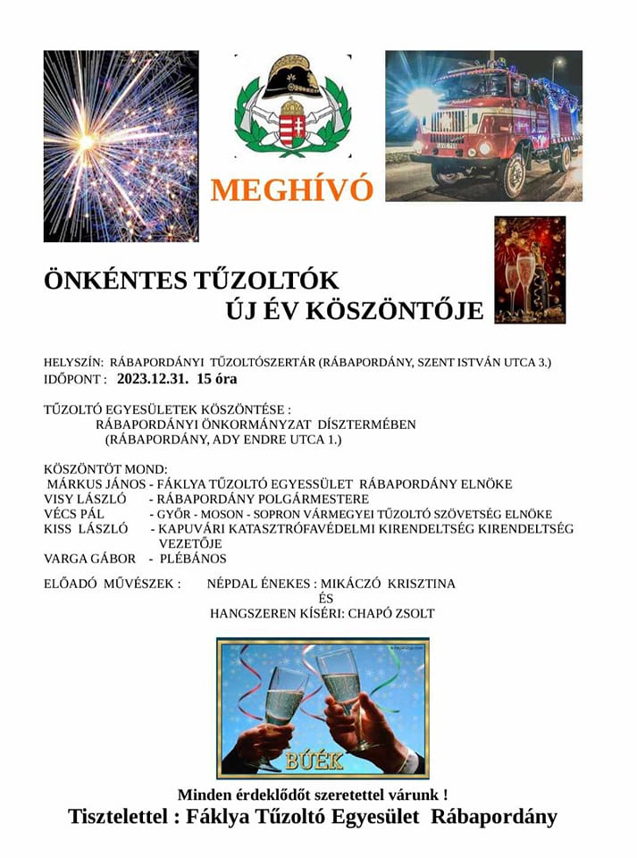 A rábapordányi Fáklya Tűzoltó Egyesület az év utolsó napjának délutánjára színes programmal várja az önkéntes tűzoltókat.