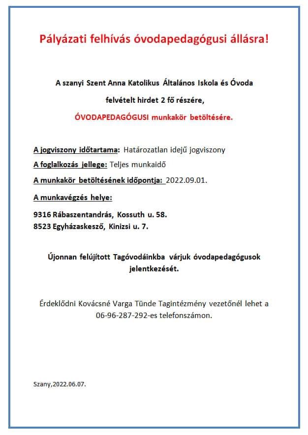 A szanyi Szent Anna Katolikus Általános Iskola és Óvoda felvételt hirdet 2 fő részére, óvodapedagógusi munkakör betöltésére az újonnan felújított Tagóvodájába.