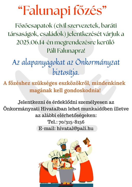 Június 14-én megrendezésre kerül a hagyományos Páli Falunap, amelynek egyik legkedveltebb programja a „Falunapi főzés”. A rendezvény keretében civil szervezetek, baráti társaságok és családok alkotta főzőcsapatok mérhetik össze tudásukat, kreativitásukat a bográcsok és üstök mellett.