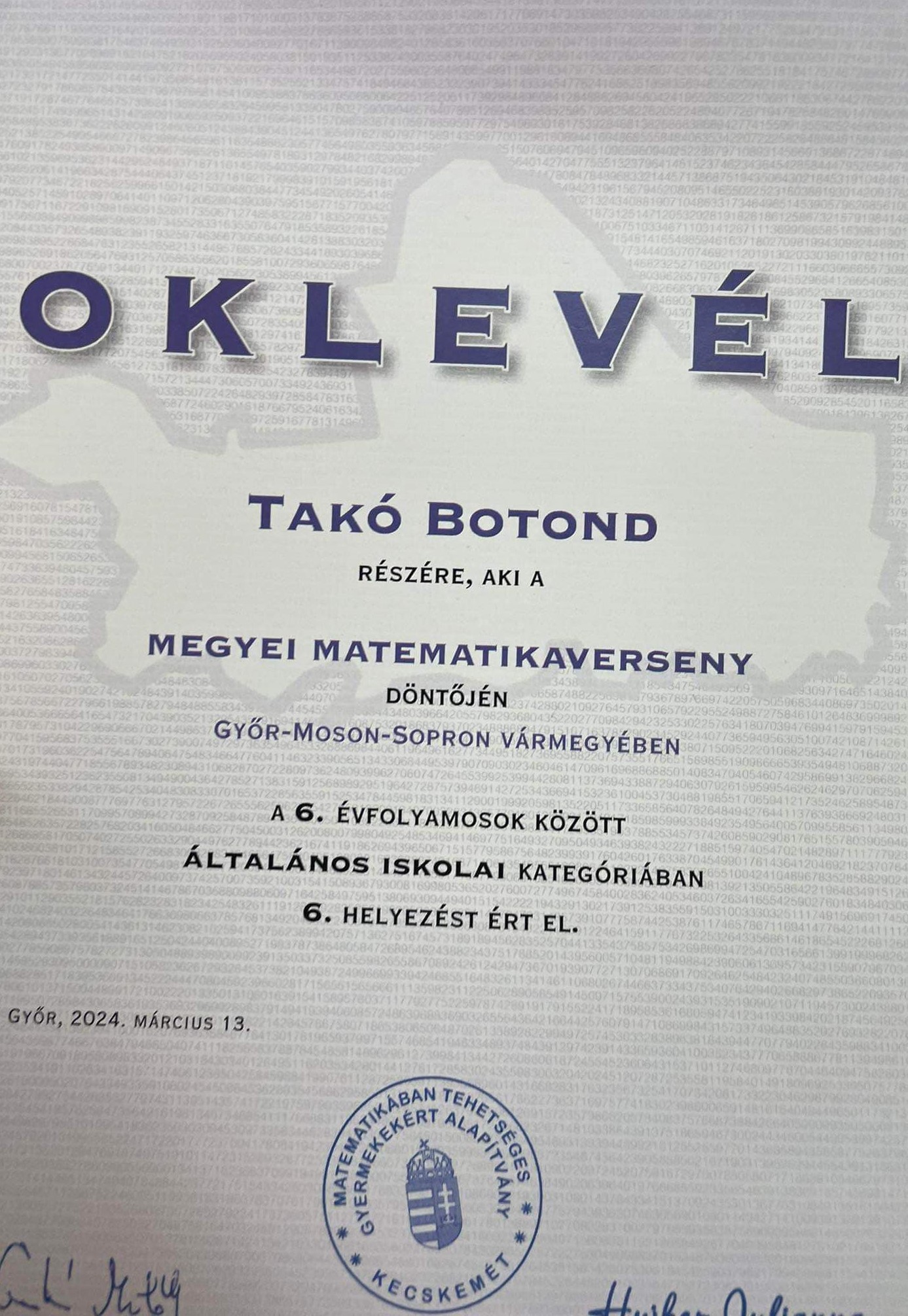 A Rábatamási Móra Ferenc Általános Iskola 6. osztályos tanulója,Takó Botond szép eredményt ért el a Megyei Matematikaverseny megyei döntőjében.