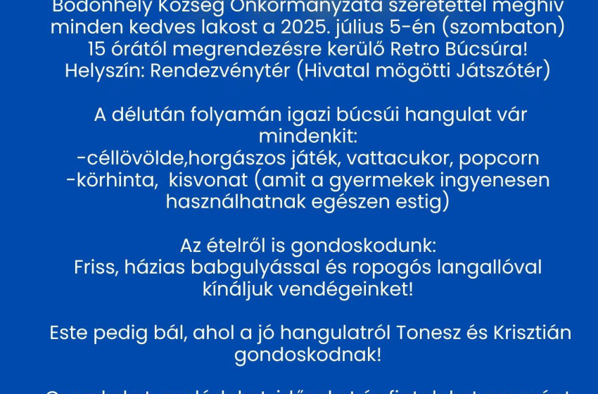 Július 5-én, szombaton ismét megelevenedik a régi idők vásári hangulata Bodonhelyen! A község önkormányzata nagy szeretettel vár mindenkit a Retro Búcsúra, amely délután 15 órakor veszi kezdetét a Rendezvénytéren, a hivatal mögötti játszótérnél.