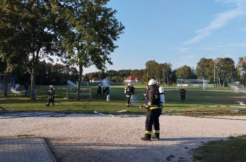 A szimuláció szerint a városi sportpálya öltözőjében tűz ütött ki, ahol két PB-gázpalack is veszélyt jelentett, és feltételezhetően egy személy tartózkodott az épületben. Az egységeknek a vonulás közben egy úttestre dőlt fát kellett eltávolítaniuk motoros láncfűrésszel, majd a helyszínre érkezve elvégezték a felderítést, a közművek elzárását, és párhuzamosan hajtották végre az életmentést és a tűz oltását. A gázpalackokat biztonságosan kihozták az épületből, majd hűtésükről is gondoskodtak.