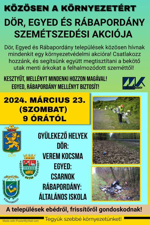 Az esemény március 23-án, szombaton 9 órakor veszi kezdetét, ahol a résztvevők Dörben a Verem kocsmánál, Egyedben a Csarnoknál, valamint Rábapordányban az Általános Iskolánál gyülekeznek. Kérik hogy minden résztvevő hozza magával a szükséges kesztyűt,mellényt, Egyed és Rábapordány biztosítja a mellényeket. A települések gondoskodnak az ebédről és frissítésekről.