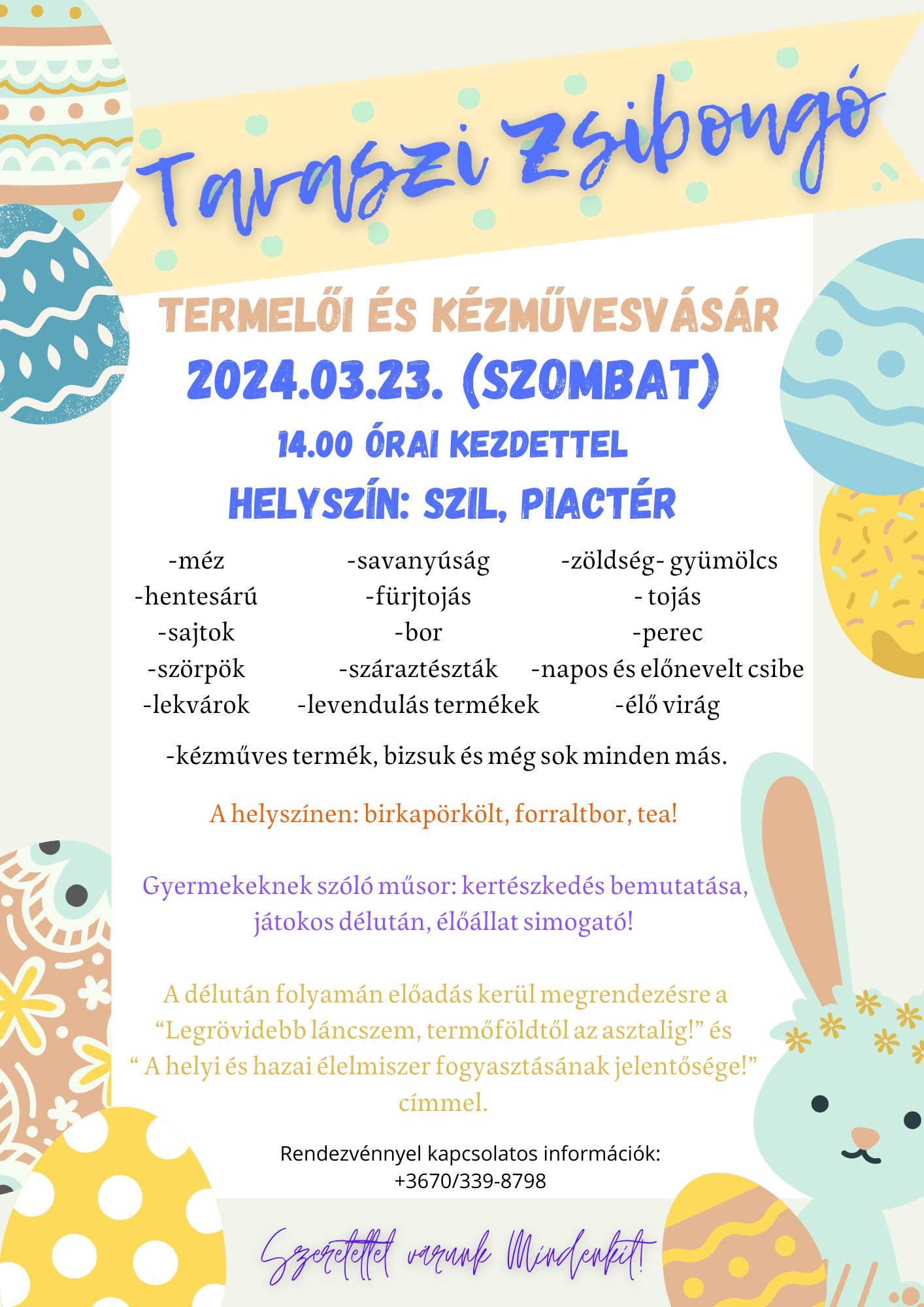 A falu piacterére várják délután 2 órától az érdeklődőket Szilban március 23-án, ahol hazai termelők mutatják be és kínálják portékáikat. Különlegesség várja az érdeklődőket a rendezvényen, ugyanis fél 3-kor kezdődik egy kerekasztalbeszélgetés „A legrövidebb láncszem a termőföldtől az asztalig, miért érdemes a termelőtől vásárolni” címmel.