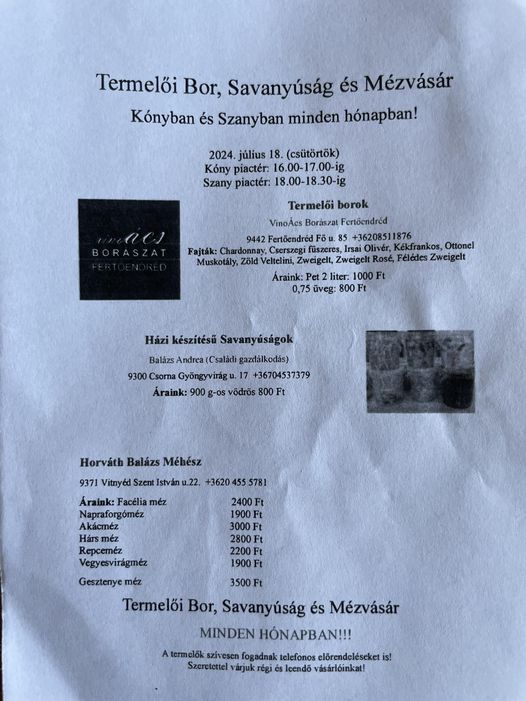 Kónyban és Szanyban egyaránt a község piacterén állítják ki portékáikat a kereskedők holnap. Kónyban délután 4 órától 5 óráig, Szanyban este 6 órától fél 7-ig várják az érdeklődőket a vásárra. A termelői borok mellett házi készítésű savanyúságokat, valamint magyar mézet vásárolhatnak közvetlenül a méhésztől az ide látogatók.