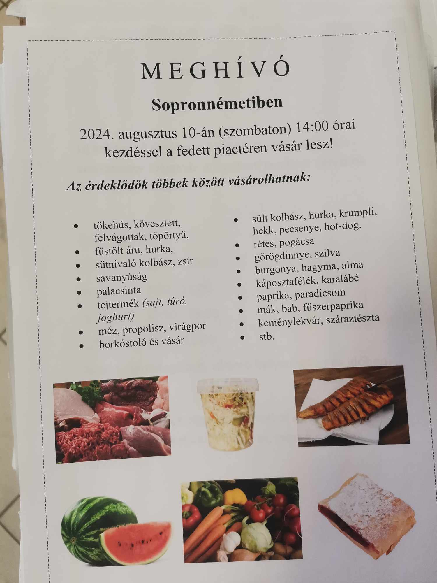 A sopronnémeti fedett piacon 2augusztus 10-én, szombaton délután két órakor vásár kerül megrendezésre, amelyet minden helyi lakos és érdeklődő számára szerveznek.