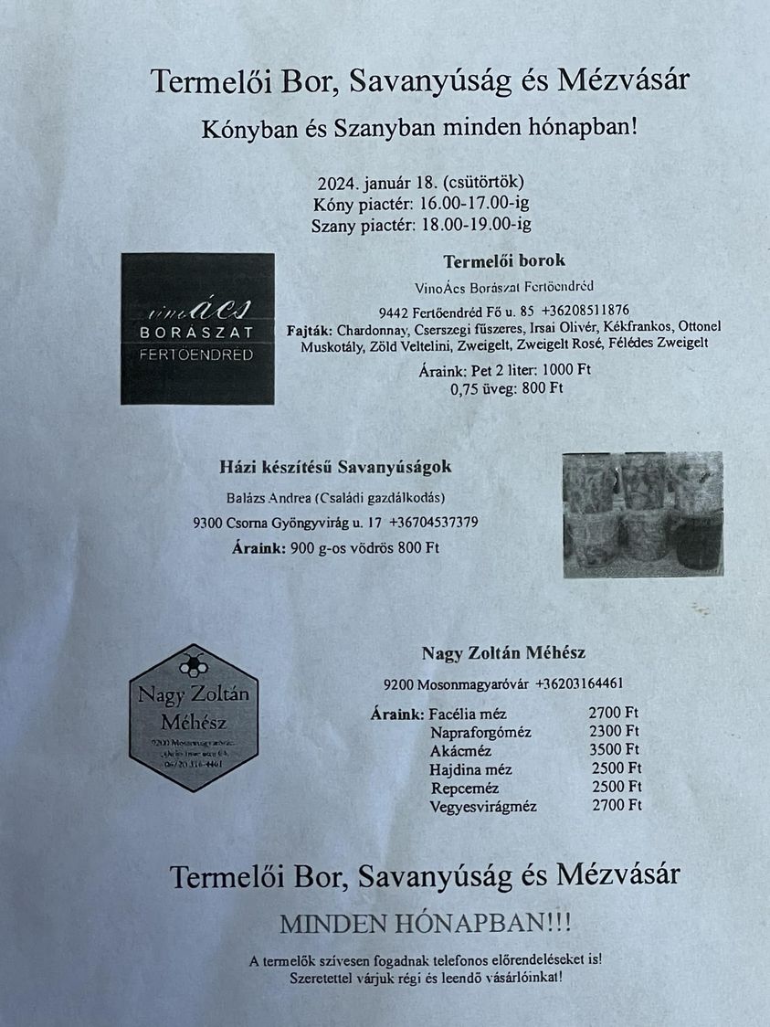 Kónyban és Szanyban egyaránt a község piacterén állítják ki portékáikat a kereskedők. Kónyban délután 4 órától 5 óráig, Szanyban este 6 órától 7 óráig várják az érdeklődőket a vásárra. A termelői borok mellett házi készítésű savanyúságokat, valamint magyar mézet vásárolhatnak közvetlenül a méhésztől az ide látogatók.