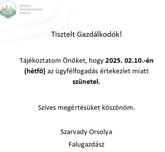 A Nemzeti Agrárgazdasági Kamara értesíti a gazdálkodókat, hogy február 10-én, hétfőn, a rábakecöli falugazdász ügyfélfogadás technikai okok miatt szünetel.
