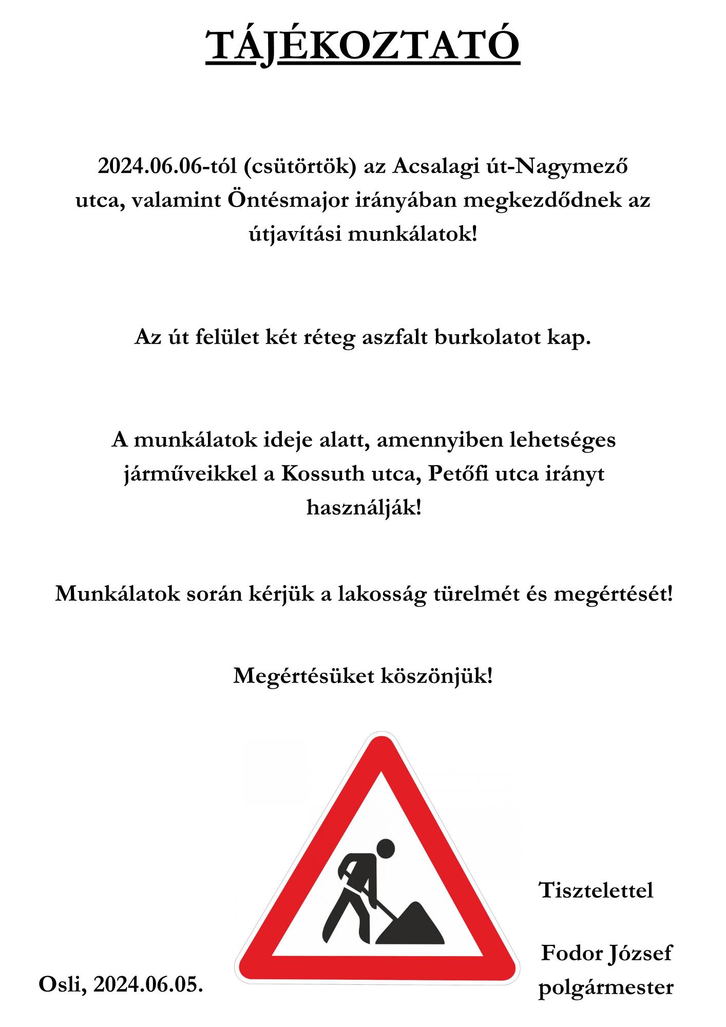 Mától Osliban az Acsalagi út, a Nagymező utca, valamint Öntésmajor irányába útjavítási munkálatok kezdődnek meg, melynek ideje alatt járművekkel a Kossuth utca és a Petőfi utca használható.