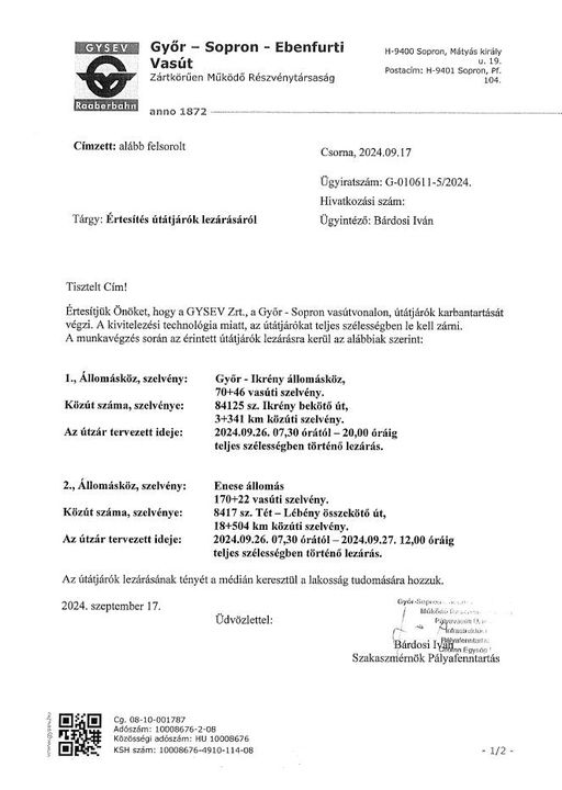 A teljes útzárak érintik az Ikrény és Enese állomások közötti vasúti átjárókat. Az Ikrény állomás közelében lévő átjáró szeptember 26-án 07:30-tól 20:00 óráig, míg az Enese állomás körüli átjáró ugyanezen a napon 08:00-tól 20:00 óráig lesz lezárva. Az autósokat a lezárások miatt alternatív útvonalak használatára kérik, a vasúti forgalom viszont zavartalanul folytatódik.