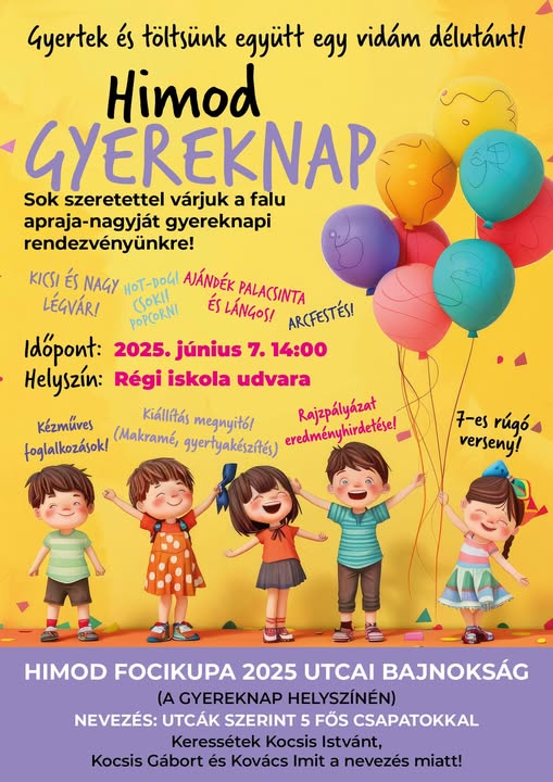 Himod község szeretettel várja a falu apraját-nagyját gyereknapi rendezvényére, amely június 7-én, szombaton 14:00 órakor kezdődik a régi iskola udvarán.