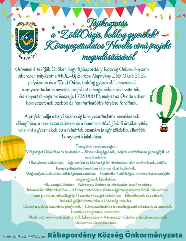 Rábapordány Község Önkormányzata sikeresen pályázott a MOL- Új Európa Alapítvány Zöld Oázis 2025 programjára, amelynek keretében megvalósíthatják a "Zöld Oázis, boldog gyerekek" elnevezésű környezettudatos nevelési projektet.