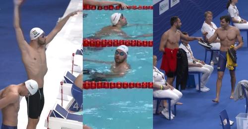 Jött aztán a férfiak 100 méteres gyorsúszása, azon belül is a kilencedik futam, benne Milák Kristóffal és a dohai világbajnokságon bravúros bronzot nyert Németh Nándorral. Ez volt az első olyan versenyszám, amit a korábban úszók közül többen is megvártak a medenceparton.