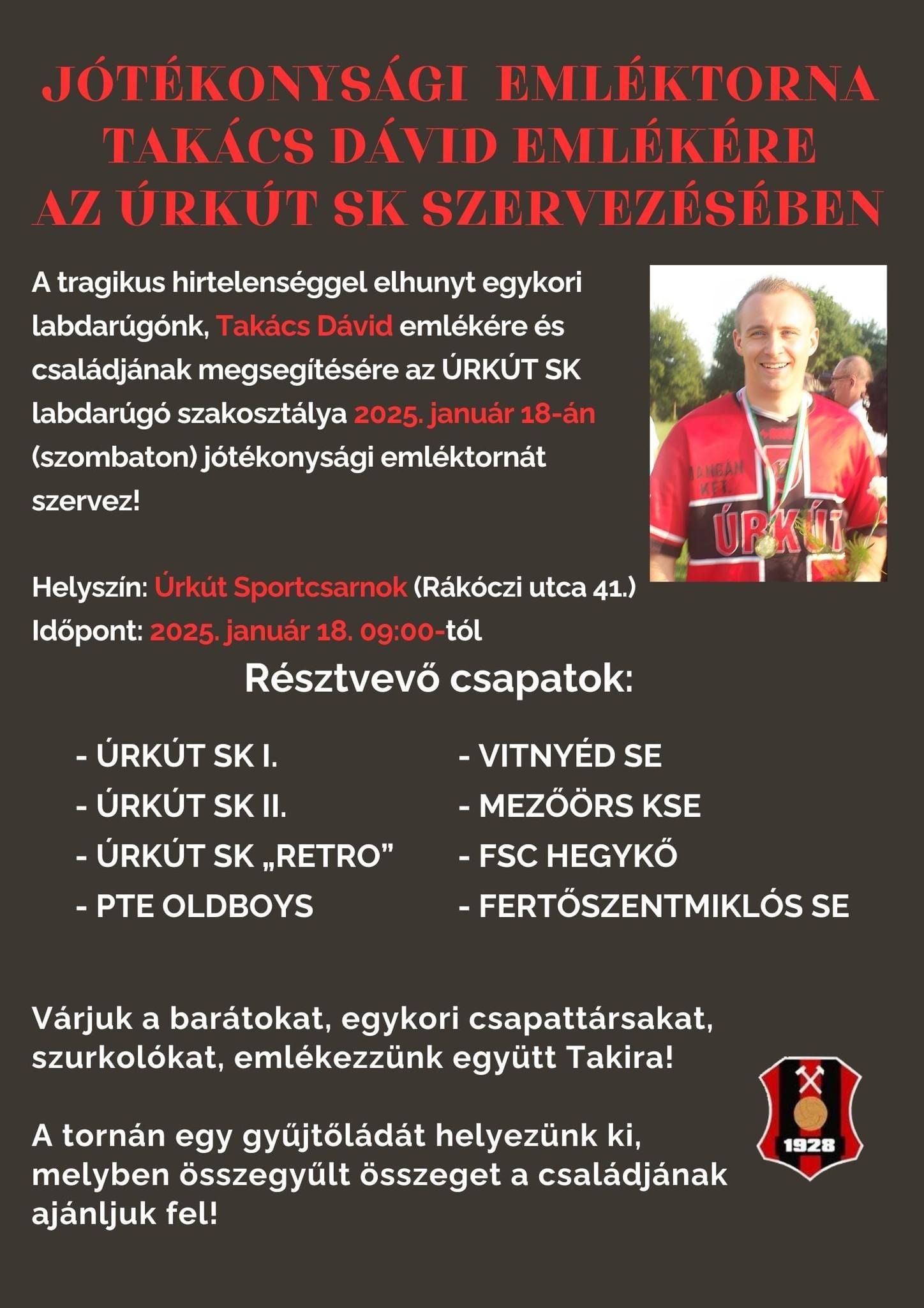 Az Űrkút SK labdarúgó szakosztálya jótékonysági emléktornát szervez január 18-án (szombaton) a tragikusan fiatalon elhunyt Takács Dávid emlékére és családja megsegítésére.