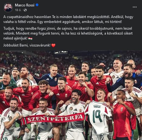 „A csapattársaidhoz hasonlóan Te is minden labdáért megküzdöttél. Anélkül, hogy valaha is féltél volna. Egy emberként aggódtunk, amikor láttuk, mi történt! Tudjuk, hogy rendbe fogsz jönni, de sajnos, ha sikerül továbbjutnunk, nem leszel velünk. Mindent meg fogunk tenni, és ha lesz rá lehetőségünk, a következő sikert neked ajánljuk! Jobbulást Barni, visszavárunk!” – írta közösségi oldalán Marco Rossi.