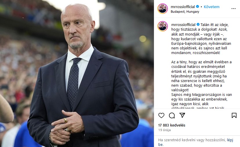 „Talán itt az ideje, hogy tisztázzuk a dolgokat! Azok, akik azt mondják – vagy írják –, hogy kudarcot vallottunk ezen az Európa-bajnokságon, nyilvánvalóan nem objektívek, és sajnos azt kell mondanom, rosszhiszeműek! – ezzel a felütéssel kezdődik Rossi Instagram-posztja. – Az a tény, hogy az elmúlt években a csodával határos eredményeket értünk el, és gyakran meggyőző teljesítményt nyújtottunk (még ha néha szerencse is kellett ehhez), nem szabad, hogy eltorzítsa a valóságot!”